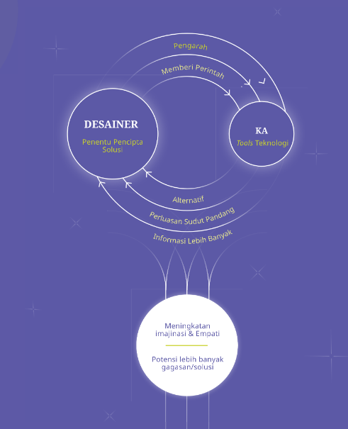 Poin ini juga ditergaskan Kembali bahwa, “dalam keseluruhan proses desain, fungsi KA sebatas sebagai pendukung yang memperkaya dan mempercepat proses kreatif dan teknis. Sebagai manusia, desainer harus memiliki empati, wawasan, dan kearifan yang esensial dalam proses desain yang tidak dapat sepenuhnya digantikan oleh teknologi. Kemampuan desainer untuk menginterpretasikan kebutuhan, memahami konteks sosial dan budaya, serta mengevaluasi solusi desain dari perspektif manusiawi, menegaskan bahwa meskipun KA adalah alat yang sangat berguna, peran kreatif dan kritis manusia tetap menjadi pusat dalam proses desain. Meskipun KA memberikan keuntungan dalam efisiensi dan kemampuan analisis data, keputusan utama tetap berada di desainer.” p47